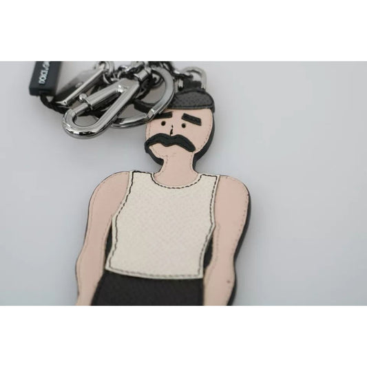 Dolce & Gabbana White Leather Printed Metal Silver Tone Keyring Keychain