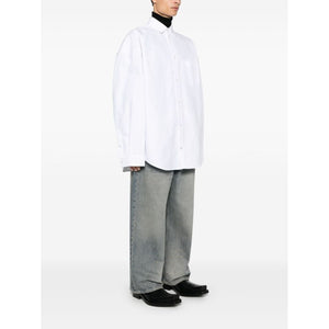 white cotton classic collar chest patch pocket drop shoulder long sleeves press-stud fastening cuffs two side slit pockets curved hem front press-stud fastening When buying this unisex item, keep in mind that it is graded in standard men's sizing. Oversized cotton shirt Size and Fit - SLEEVE LENGTH: 92.0 Centimetres. LENGTH: 95.0 Centimetres.