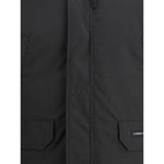Canada Goose ChilliWack Bomber Jacket by Canada Goose, high collar with drawstring-adjustable hood, front closure by concealed zipper and snap buttons, two side welt pockets, elastic ribbed cuffs, ribbed hem, contrasting applied iconic brand monogram patch on left sleeve, two front pockets with snap button closure, padded monochrome design, regular fit.