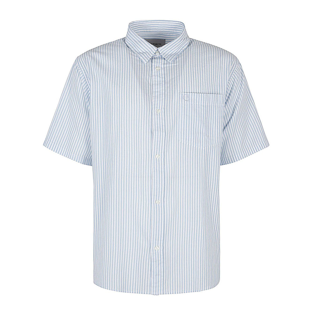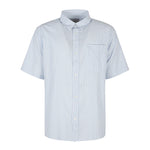 White and light blue striped shirt, straight hem. Cotton shirt Size and Fit - This piece fits true to size. We recommend you get your regular size. Model is 1,84m / 6ft 1in wearing size M