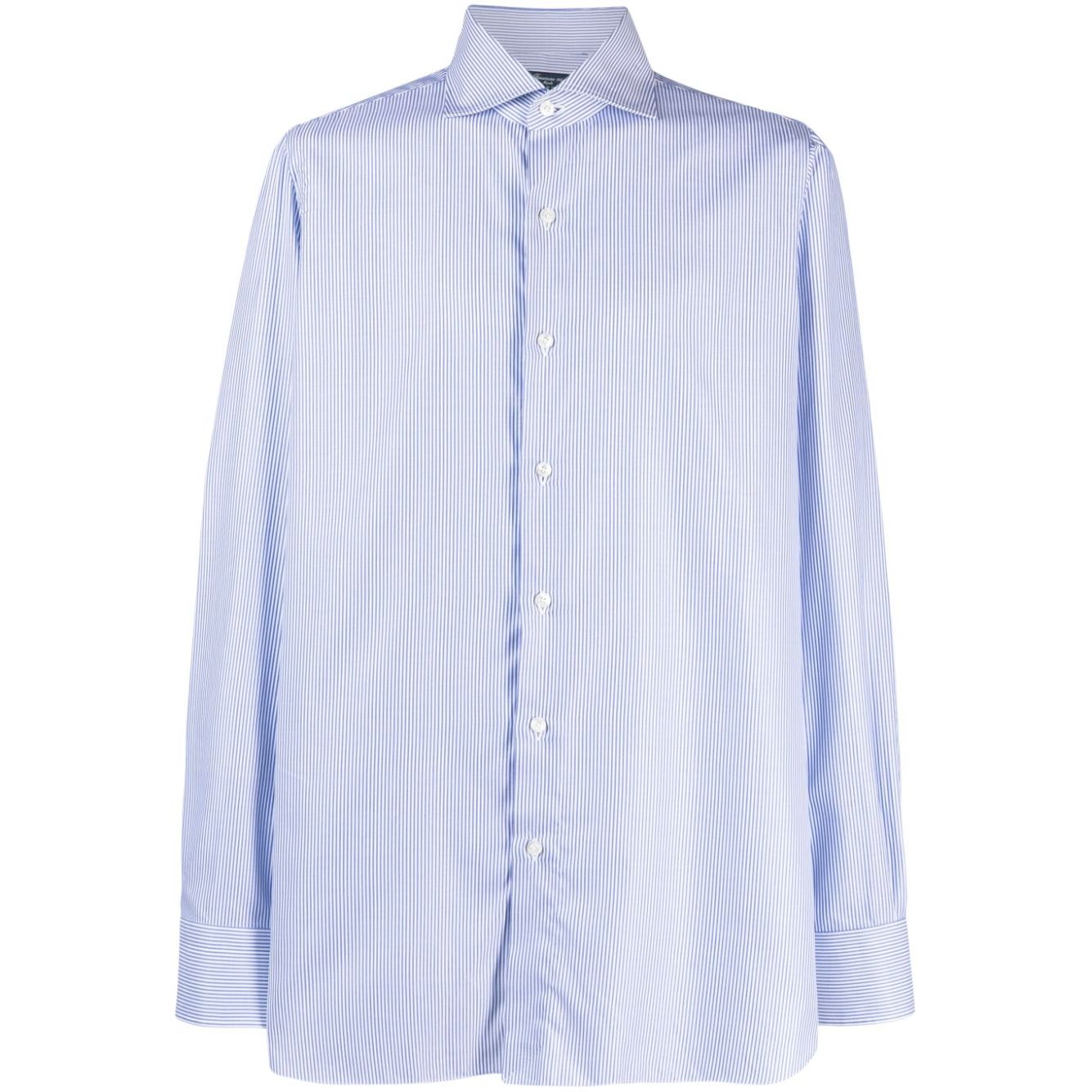 Blue shirt, striped, buttons closure. Striped cotton shirt Size and Fit - This piece fits true to size. We recommend you get your regular size. Model is 1,84m / 6ft 1in wearing size 39 (COLLAR CM)
