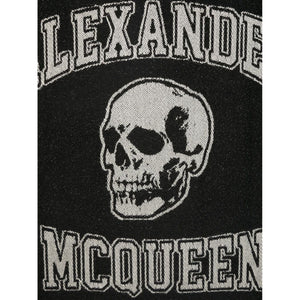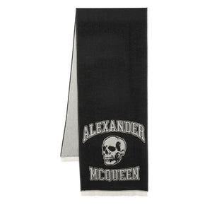 logo-print wool scarf from Alexander McQueen featuring black, logo print to the front, skull print, frayed hem and wool. Logo wool scarf Size and Fit - LENGTH: 180.0 Centimetres. WIDTH: 37.0 Centimetres.