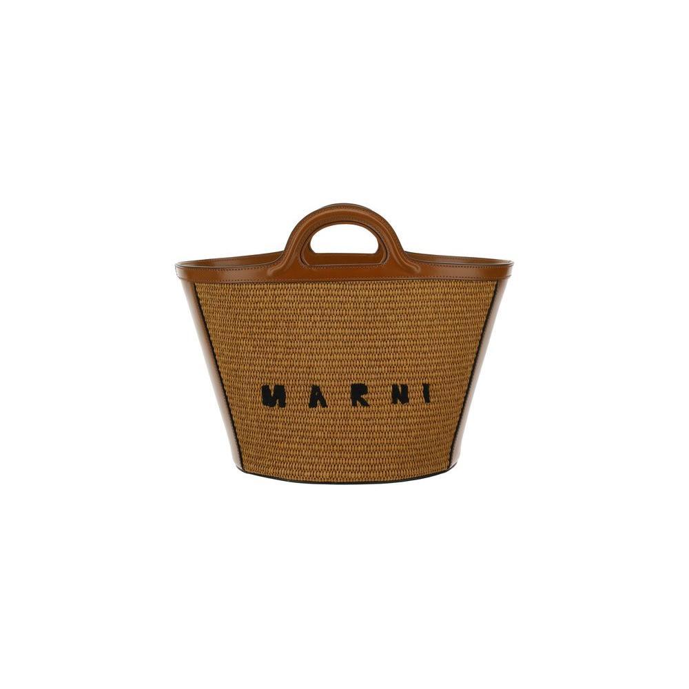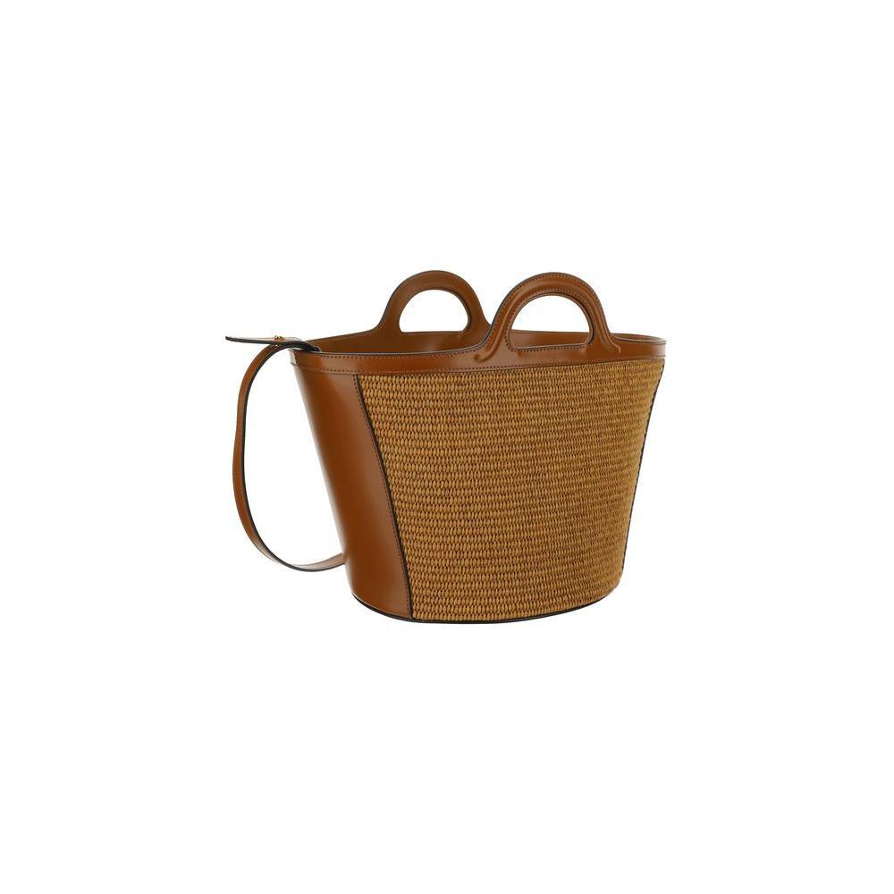 Tropicalia Bucket Bag by Marni, all-over raffia design, contrasting leather trim and details, double round and fixed leather top handles, adjustable flat shoulder strap, interior drawstring closure, matching fabric lining, iconic brand monogram embroidered in contrasting color on the front, interior zipper pocket.