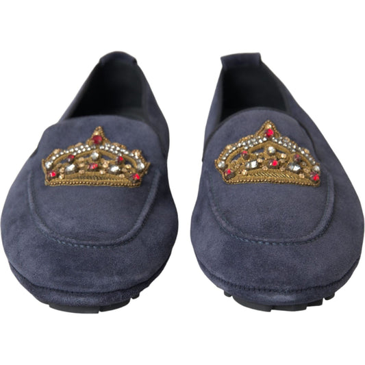Dolce & Gabbana Blue Leather Suede Crystal Crown Loafers Shoes