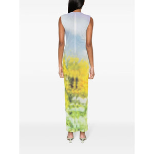 blue/yellow/green mesh design ombré print round neck sleeveless mesh lining concealed rear hook and zip fastening Printed long dress Size and Fit - This piece fits true to size. We recommend you get your regular size. Model is 1,75m / 5ft 8in wearing size S
