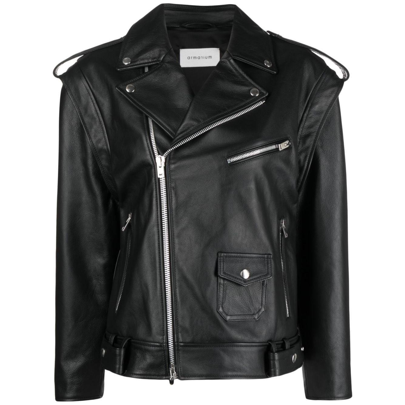 black lambskin grained texture silver-tone hardware wide notch lapels off-centre front zip fastening long sleeves straight hem cuff zips zip-fastening chest pocket two side zip-fastening pockets coin pocket Leather biker jacket Size and Fit - This piece fits true to size. We recommend you get your regular size. Model is 1,75m / 5ft 8in wearing size 40 (IT)