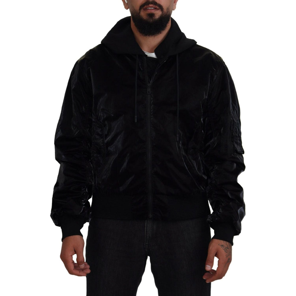 穿上这款绝对惊艳、100% 正品 Dolce & Gabbana 连帽飞行员夹克,时尚出门。这款夹克非常适合为您的衣橱增添一丝奢华感,采用全拉链闭合设计,配有两个外袋和两个内袋,既实用又不失优雅。意大利精制而成,采用时尚的黑色色调,确保多功能性和永恒的吸引力。徽标细节为这款精美单品增添了独特的触感,使其成为时尚人士的必备单品。