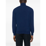 • Rear view of a blue Brunello Cucinelli Cashmere zip-up sweatshirt showing ribbed cuffs and hem.