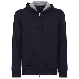 cobalt blue/grey cotton blend jersey texture drawstring hood long sleeves two front pouch pockets ribbed cuffs and hem front two-way zip fastening Cotton blend zipped hoodie