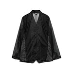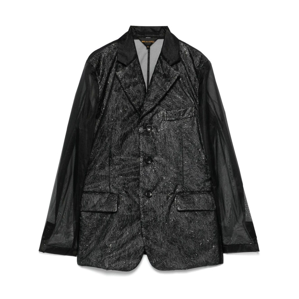 black front button fastening buttoned cuffs rear slit semi-sheer panels Chiffon blazer jacket Size and Fit - This piece fits true to size. We recommend you get your regular size. Model is 1,75m / 5ft 8in wearing size S