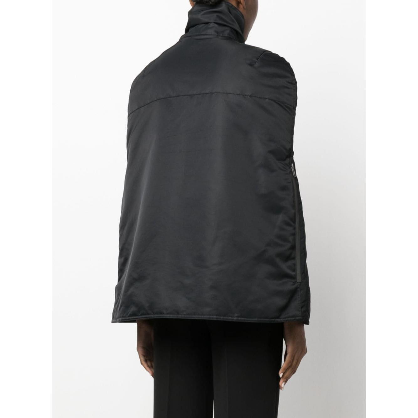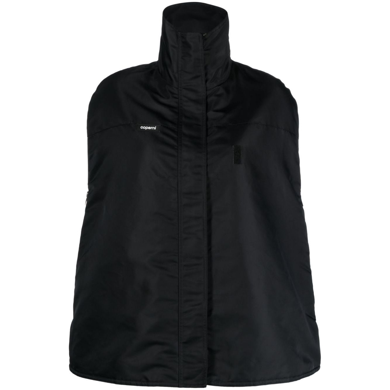 logo-patch bomber cape from COPERNI featuring black, cape design, logo patch at the chest, funnel neck, concealed front fastening, two side zip-fastening pockets and straight hem. Logo bomber cape Size and Fit - This piece fits true to size. We recommend you get your regular size. Model is 1,75m / 5ft 8in wearing size 36 (FR)