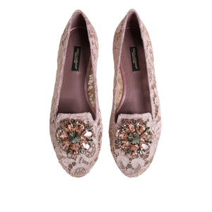 Gorgeous brand new, 100% Authentic Dolce & Gabbana elegant Vally shoes are exquisitely crafted in Italy from the finest Taormina lace. Seen here in light pink, these pretty floral lace Vally slippers from Dolce & Gabbana will instantly lift your look to new sartorial heights. Featuring an almond toe, a branded leather insole and a wearable flat leather sole, these beauties are finished with a sparkling decorative crystal flower on the front.