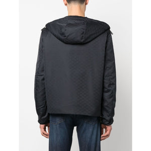 navy blue monogram jacquard logo-engraved silver-tone hardware drawstring hood front two-way zip fastening long sleeves elasticated cuffs straight hem Nylon blouson jacket