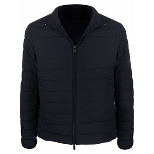 Navy blue feather down padded logo-patch jacket from EMPORIO ARMANI featuring padded design, logo patch to the side, front zip fastening, long sleeves and high neck. Zipped short down jacket Size and Fit - This piece fits true to size. We recommend you get your regular size. Model is 1,84m / 6ft 1in wearing size 48 (IT)