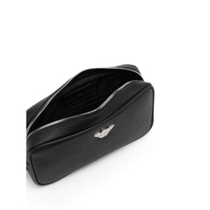 Eagle-plaque zipped wash bag from EMPORIO ARMANI featuring black, textured finish, silver-tone logo plaque, top zip fastening, silver-tone hardware, detachable wrist strap, main compartment and multiple internal slip pockets. Logo beauty-case Size and Fit - Width 8,66 in / 22 cm Height 4,72 in / 12 cm Depth 2,36 in / 6 cm Handle 7,09 in / 18 cm