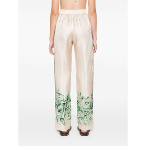 blush beige silk twill weave palazzo design elasticated waistband with internal drawstring piped-trim detailing two diagonal pockets to the sides floral print wide leg Silk printed trousers Size and Fit - This piece fits true to size. We recommend you get your regular size. Model is 1,75m / 5ft 8in wearing size S