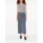 grey organic cotton denim appliqué logo front slit belt loops front button fastening classic five pockets maxi straight hem This item is made from at least 50% organic materials. Learn more about what makes a product Conscious on our Conscious Criteria page Slit denim long skirt Size and Fit - This piece fits true to size. We recommend you get your regular size. Model is 1,75m / 5ft 8in wearing size 36 (FR)