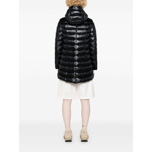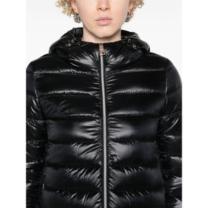 black feather down padded design drawstring hood front two-way zip fastening long sleeves two side zip-fastening pockets rear curved hem full lining A-shape midi down jacket