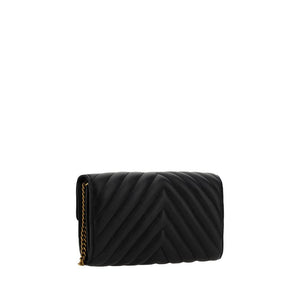 Calfskin Love One Shoulder Wallet by Pinko, front magnetic flap closure, iconic gold-plated and embossed Love Birds logo on front, quilted and padded design, double interior compartment, chain shoulder strap, card slot inside, bill compartment, zippered coin pocket, iconic tone-on-tone embroidered brand monogram on back.