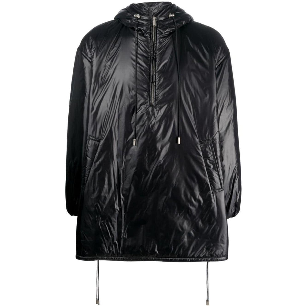 Cassandre Anorak oversized hooded coat from SAINT LAURENT featuring jet black, padded design, glossy finish, embroidered logo to the rear, slouchy drawstring hood, half front zip fastening, two side welt pockets, drop shoulder, long sleeves, elasticated cuffs and drawstring hem. Nylon blouson Size and Fit - This piece fits true to size. We recommend you get your regular size. Model is 1,84m / 6ft 1in wearing size 48 (IT)