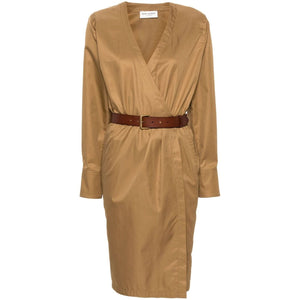 camel brown cotton twill weave V-neck long sleeves buttoned cuffs detachable waist belt two side inset pockets unlined straight hem We've partnered with Good On You — an independent agency that rates how brands perform in relation to their impact on the planet, people and animals, with a multi-criteria rating simplified to a five points scale. In order to be awarded our conscious label, larger brands need to score a minimum of four out of five ('Good'), while smaller brands must score at least three out of five ('It's A Start'). This item comes from a brand rated three out of five ('It's A Start') by Good on You at the time it was added on FARFETCH. Please note, this is a brand-level rating and does not guarantee that this product is made with conscious materials. Learn more about what makes a product Conscious on our Conscious Criteria page Cotton twill midi dress Size and Fit - This piece fits true to size. We recommend you get your regular size. Model is 1,75m / 5ft 8in wearing size 36 (FR)