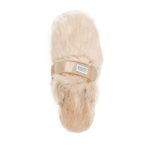 Zavo 2-EU faux-fur slides from SUICOKE featuring faux-fur design, logo patch to the front, front touch-strap fastening, flat rubber sole, almond beige, round toe and slip-on style. Faux fux slides Size and Fit - Heel 1,2 in / 3 cm; Platform 0,8 in / 2 cm