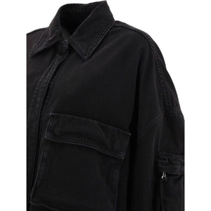black cotton classic collar concealed front fastening long sleeves buttoned cuffs multiple cargo pockets curved hem Fern denim jacket Size and Fit - This piece fits true to size. We recommend you get your regular size. Model is 1,75m / 5ft 8in wearing size 40 (IT)