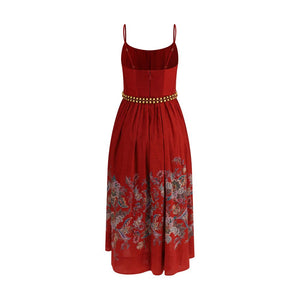 The Rhiannon Midi Dress by Zimmermann is a feminine and romantic piece with timeless appeal. The corset style with thin straps enhances the bust, while the gathered waist gives volume and movement to the silhouette. The flared bottom is embellished with a delicate floral pattern, perfect for summer. At the back, the dress features a gathered insert and a central zipper closure for a comfortable and defined fit. An ideal look for special occasions or summer days with sophisticated taste.